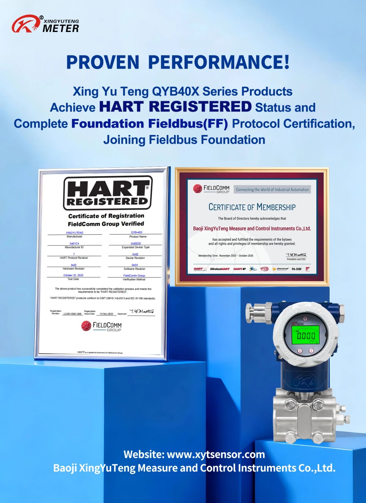 宝鸡市兴宇腾测控设备有限公司迎来重大技术突破——公司核心产品QYB40X单晶硅系列变送器成功通过国际FieldComm Group组织的严格验证,一举斩获"HART注册认证"与"Foundation Fieldbus(FF)协议认证"双重国际认证。这一里程碑式的成就,标志着公司在工业自动化通信协议技术领域已达到国际先进水平。